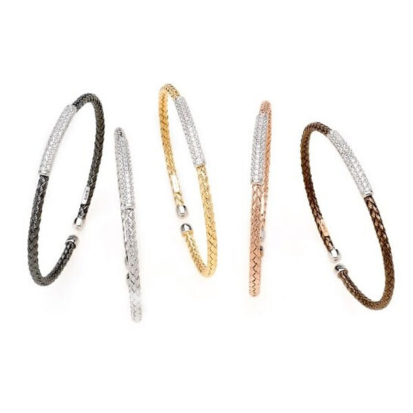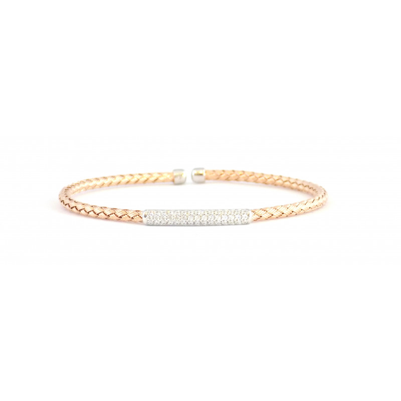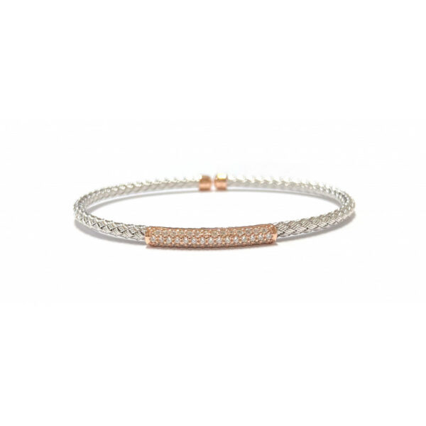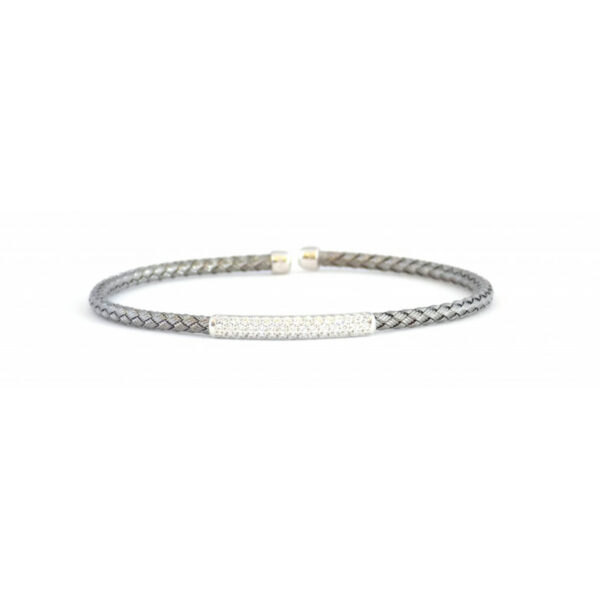 Bracelet en argent au design tressé, orné d’un motif barrette serti d’oxydes de zirconium. Il se distingue par son ouverture discrète sous le bracelet pour un porté confortable au quotidien.